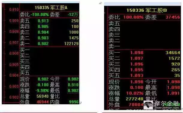 新基金上市时,这点体现的最为明显,这是融通军工分级的AB份额上市首日的表现,非常明显,下图是融通军工分级AB份额上市首日表现。